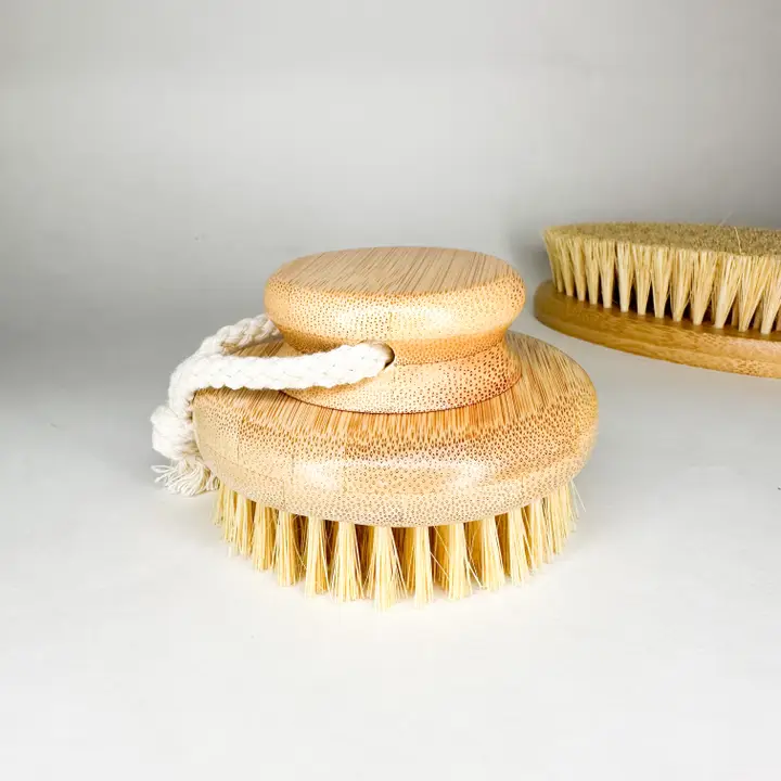 Eco-friendly bamboo dry body brush with natural sisal bristles. Exfoliates, supports lymphatic drainage, improves circulation, and reduces cellulite appearance. Perfect for glowing, radiant skin.